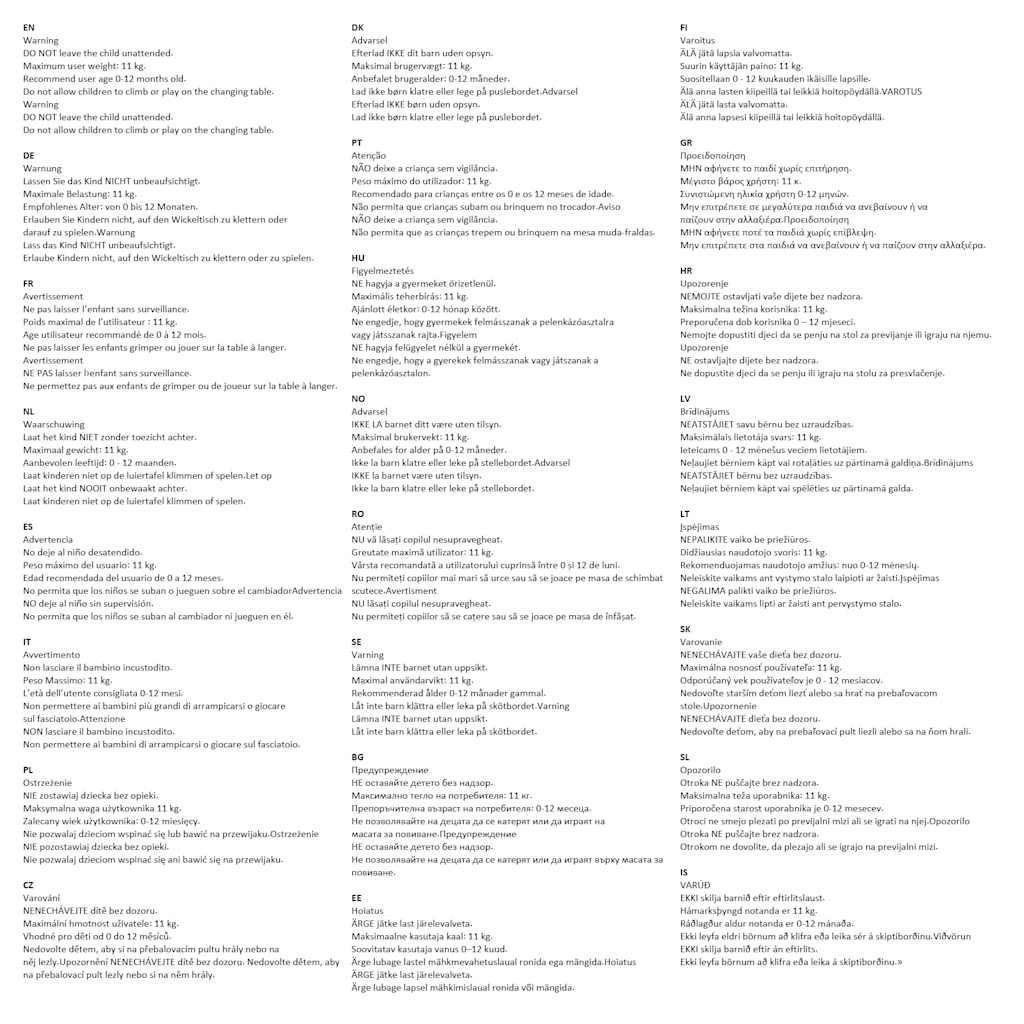Opozorilo Otroka NE puščajte brez nadzora. Maksimalna teža uporabnika: 11 kg. Priporočena starost uporabnika je 0-12 mesecev. Otroci ne smejo plezati po previjalni mizi ali se igrati na njej.Opozorilo Otroka NE puščajte brez nadzora. Otrokom ne dovolite, da plezajo ali se igrajo na previjalni mizi.
