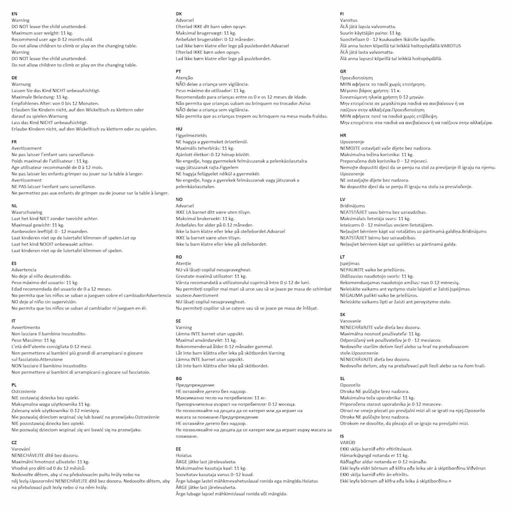 Opozorilo Otroka NE puščajte brez nadzora. Maksimalna teža uporabnika: 11 kg. Priporočena starost uporabnika je 0-12 mesecev. Otroci ne smejo plezati po previjalni mizi ali se igrati na njej.Opozorilo Otroka NE puščajte brez nadzora. Otrokom ne dovolite, da plezajo ali se igrajo na previjalni mizi.