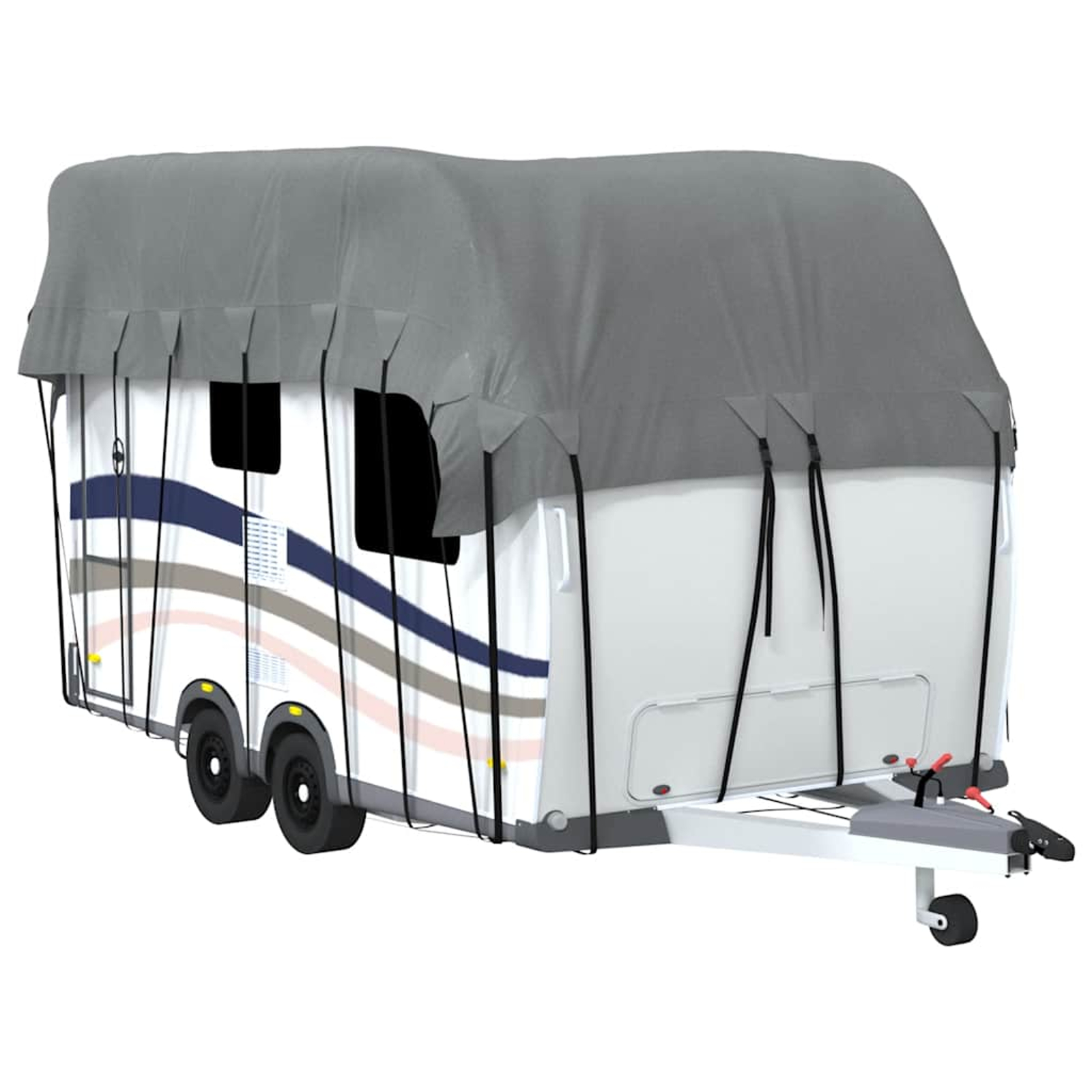 • Vetrovna zasnova: Zaradi nastavljivih trakov z zaponkami po celotni dolžini ostane strešna prevleka za prikolico varno na mestu tudi v dneh z močnim vetrom.