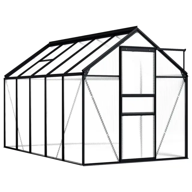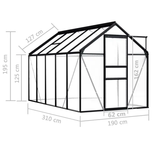 Prostoren rastlinjak s skupno površino 5,89 m² je primeren za precejšnje število rastlin. To bo odlična izbira za zaščito vaših rastlin pred hladnim vremenom. Ta trden rastlinjak iz polikarbonatnih panelov je odporen na UV in toplotno izoliran. Rastlinjak ima močno aluminijasto konstrukcijo, ki ne potrebuje vzdrževanja in nudi izjemno stabilnost. Žlebovi omogočajo učinkovito odtekanje vode, strešni zračnik pa zagotavlja optimalno prezračevanje ob vročih dnevih. Strešni paneli so pritrjeni s kovinskimi pripenjali, ki zagotavljajo vzdržljivost in dolgotrajno uporabo. Naš rastlinjak je preprost za sestavo. Prosimo, upoštevajte, da temelji niso priloženi; zato streha rastlinjaka ne more prenesti večje količine snega. Opozorilo: Rastlinjak ni gradbeni objekt ali zimski vrt, namenjen za prosti čas. Je nestalna samostojna kmetijska konstrukcija, namenjena izključno ljubiteljskemu vrtnarjenju.Barva: Antracitna in prosojnaMaterial: Aluminij, polikarbonatDimenzije: 190 x 310 x 125/195 cm (D x Š x V)Talna površina: 5,89 m²Prostornina: 9,424 m³Debelina panelov: 4 mmOdporno na UVPotrebno sestavljanje: Da 48211