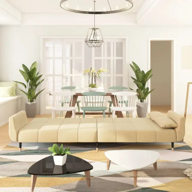 Ta raztegljiv kavč je zasnovan tako, da se raztegne. Tako lahko izbirate med sedenjem, ležanjem ali spanjem glede na svoje želje in udobje. To je idealen kos pohištva, če potrebujete dodaten prostor za spanje za svoje prijatelje in goste.