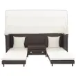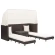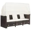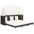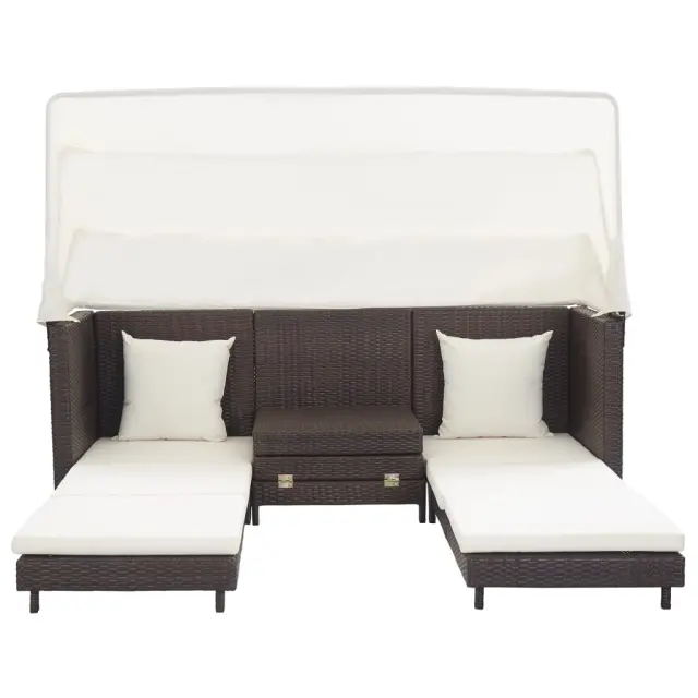 Zahvaljujoč na vremenske vplive odpornemu PE ratanu je kavč z ležiščem preprost za čiščenje, trpežen in primeren za vsakodnevno uporabo. Jeklen okvir s prašnim premazom daje kavču trdnost in stabilnost. Mehke, debelo podložene blazine so zelo udobne ter zagotavljajo, da je kavč z ležiščem popoln prostor za sproščanje. Ta kavč se lahko s podaljšanjem pretvori v kavč za eno, dve ali tri osebe. Priložena streha se lahko uporablja kot senčnik. Ta izdelek je preprost za sestavo.