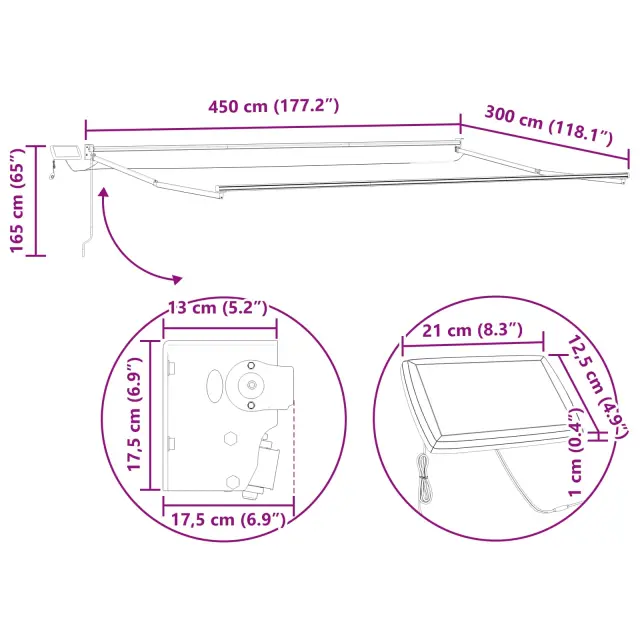 Ta ročna senčnica z solarno LED osvetlitvijo nudi senco in svetlobo za terase, verandice in druge zunanje prostore. Njen zložljiv dizajn vam omogoča, da jo podaljšate ali zložite, da prilagodite senco glede na sonce.