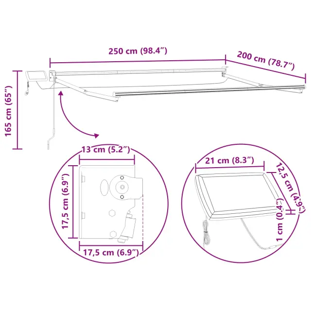 Ta ročna senčnica z solarno LED osvetlitvijo nudi senco in svetlobo za terase, verandice in druge zunanje prostore. Njen zložljiv dizajn vam omogoča, da jo podaljšate ali zložite, da prilagodite senco glede na sonce.