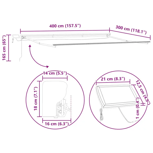 • Vgrajena luč: Opremljena z LED lučmi, tenda ne le nudi senco čez dan, ampak tudi osvetljuje vaš zunanji prostor ponoči. Energijsko varčne LED diode oddajajo prijeten, topel sijaj, ki prispeva k vsakemu večernemu srečanju.