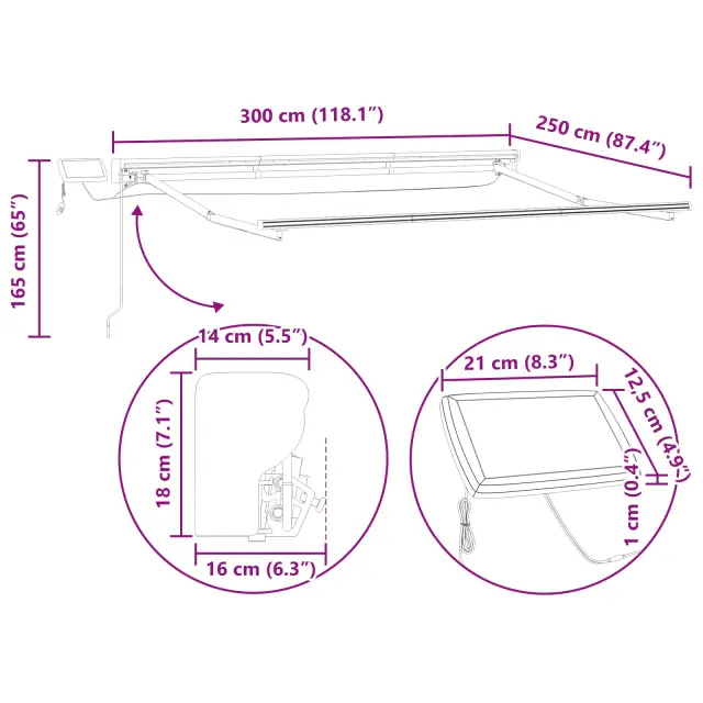• Vgrajena luč: Opremljena z LED lučmi, tenda ne le nudi senco čez dan, ampak tudi osvetljuje vaš zunanji prostor ponoči. Energijsko varčne LED diode oddajajo prijeten, topel sijaj, ki prispeva k vsakemu večernemu srečanju.