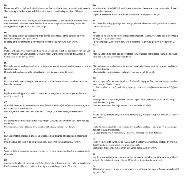 Nikoli ne nameščajte na visoka in vetrovna mesta, saj lahko senčilo pade in poškoduje ljudi. Če je hitrost vetra višja od 27 km/h, je treba tendo umakniti.
