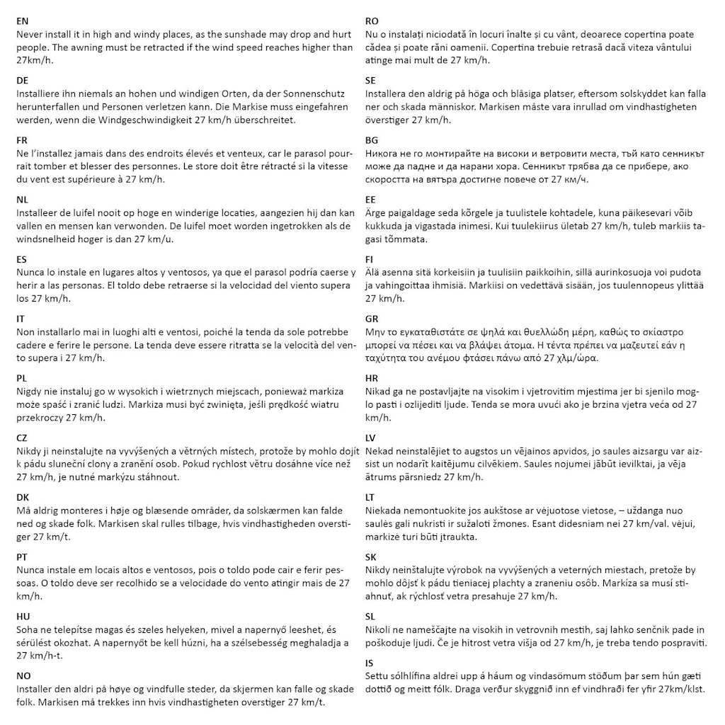 Nikoli ne nameščajte na visokih in vetrovnih mestih, saj lahko senčnik pade in poškoduje ljudi. Če je hitrost vetra višja od 27 km/h, je treba tendo pospraviti.