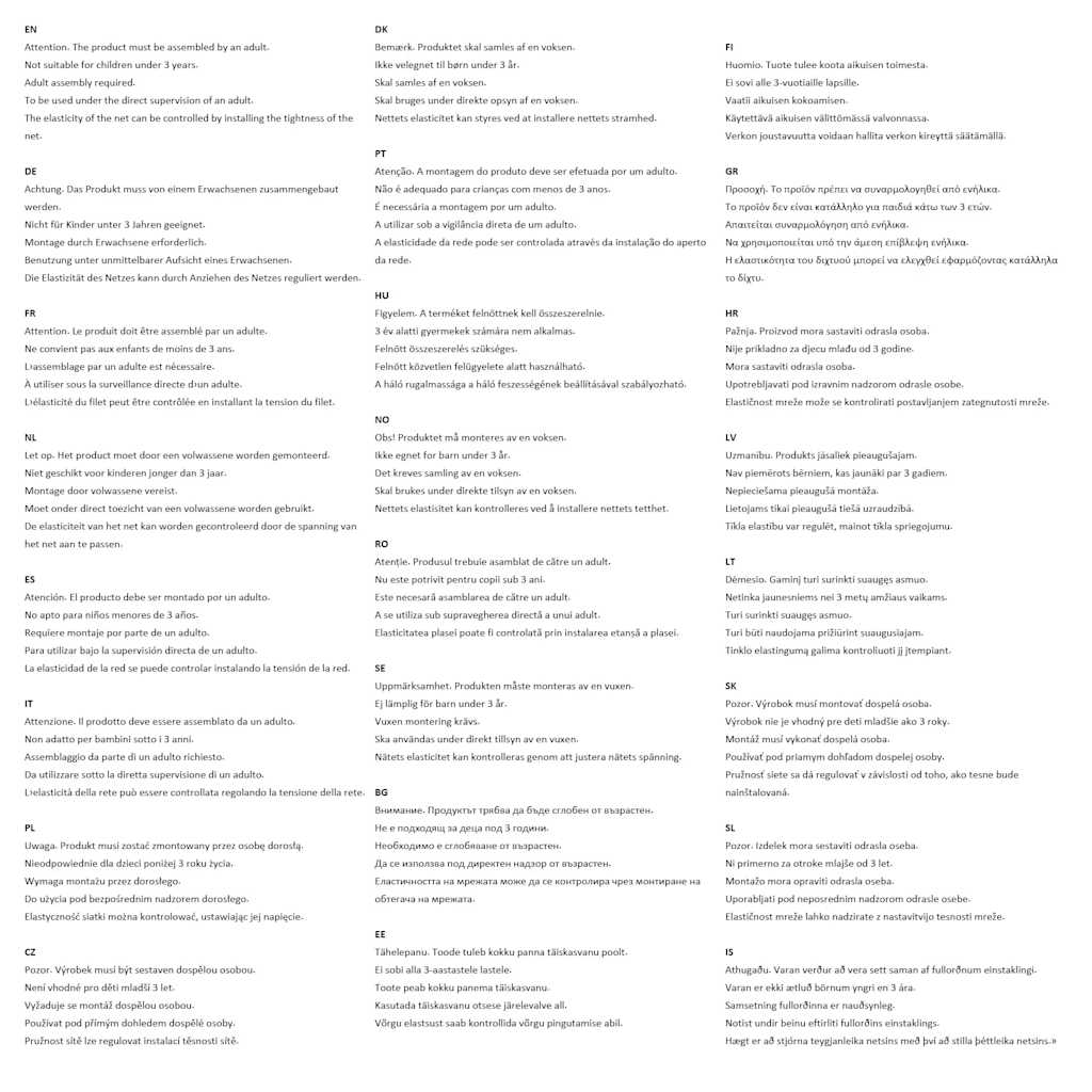 Pozor. Izdelek mora sestaviti odrasla oseba. Ni primerno za otroke mlajše od 3 let. Montažo mora opraviti odrasla oseba. Uporabljati pod neposrednim nadzorom odrasle osebe. Elastičnost mreže lahko nadzirate z nastavitvijo tesnosti mreže.