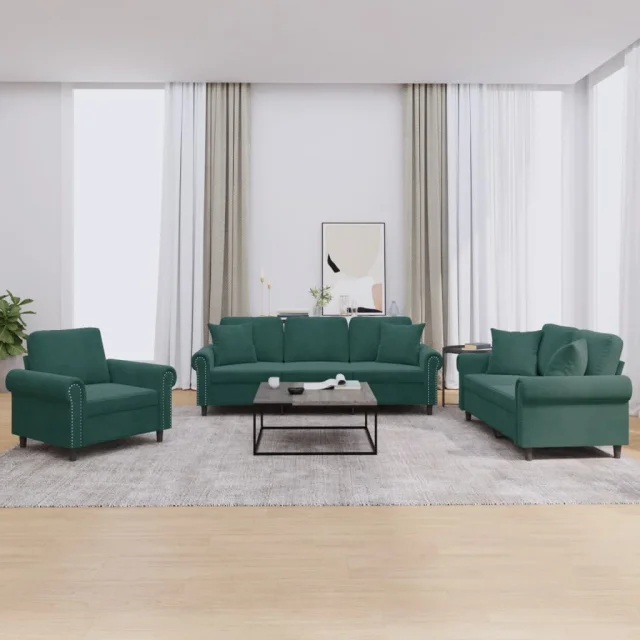 vidaXL Sedežna garnitura 3-delna z vzglavniki temno zelen žamet