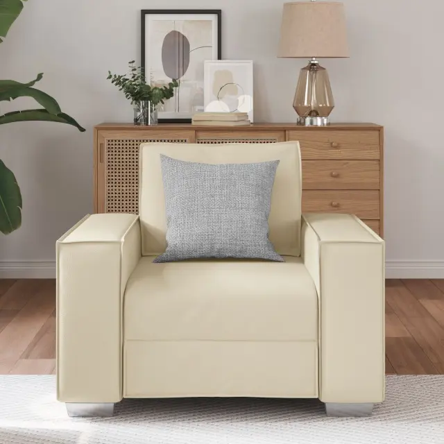 Ta kremasti sofa stol je eleganten dodatek tvojem prostoru. Njegov moderni videz se odlično prilega, bodisi v dnevni sobi ali pisarni, in nudi udobno sedenje za sprostitev ali delo.