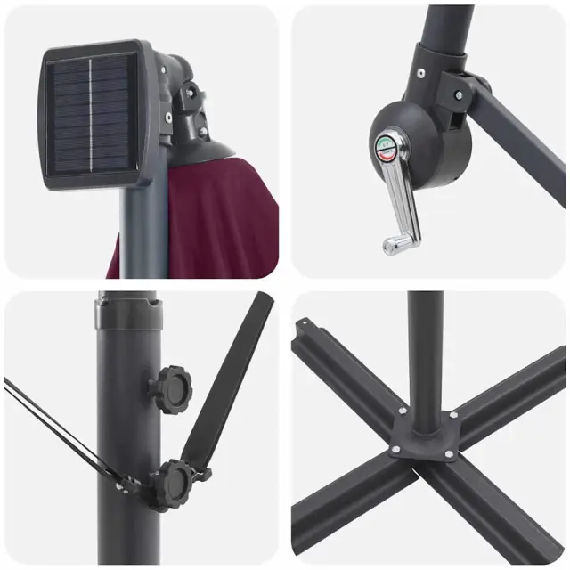 • LED osvetlitev: Ta senčnik ima energijsko varčne LED luči, ki jih napaja sončna energija. Osvetlitev vnese pridih elegance in je odlična za večerna druženja.