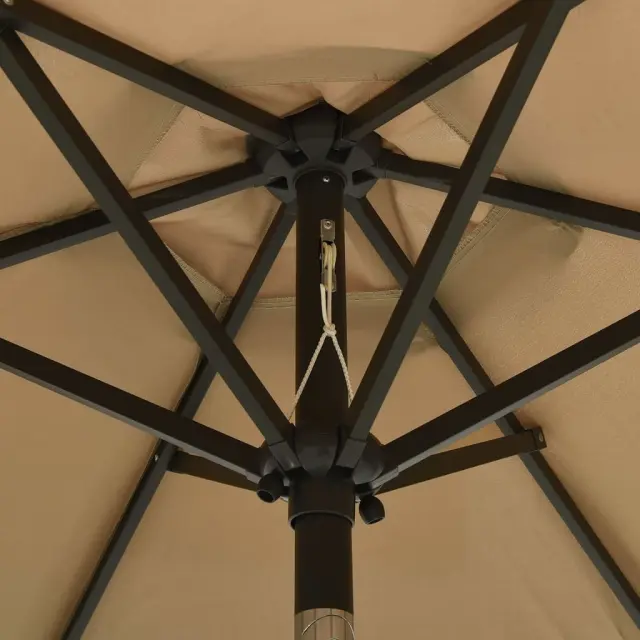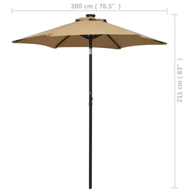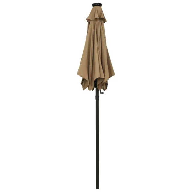 Ta eleganten senčnik, ki ga lahko namestite na stojalo ali v za to namenjeno odprtino na sredini mize, je popolna izbira za zaščito pred škodljivimi UV žarki in vlago. Nudil vam bo odlično zatočišče za branje knjige ali pitje kave z družinskimi člani, odličen pa je za vaše dvorišče, teraso ali vrt. Zahvaljujoč ročici in nagibnemu dizajnu je ta senčnik zložljiv in prenosen. Senčna ponjava je izdelana iz poliestra, ki zagotavlja UV zaščito in optimalno zaščito pred soncem ter ne bledi. Robusten aluminijast drog s prašnim premazom ter šestimi kovinskimi podporniki zagotavlja trdnost in izjemno vzdržljivost, da vam bo ta senčnik služil še dolgo. Senčnik ima 12 LED lučk, ki osvetljujejo vaš bivalni prostor ter po zahodu sonca ustvarjajo prijetno in romantično vzdušje.Barva: Taupe in temno sivaMaterial: Blago (100 % poliester), aluminij s prašnim premazomDimenzije: 200 x 211 cm (premer x V)NagibnoZ zračnikom in sistemom z ročicoZ 12 LED lučkamiPotrebno sestavljanje: Da 313560