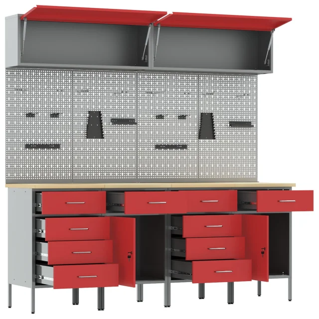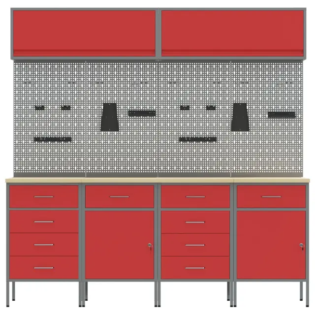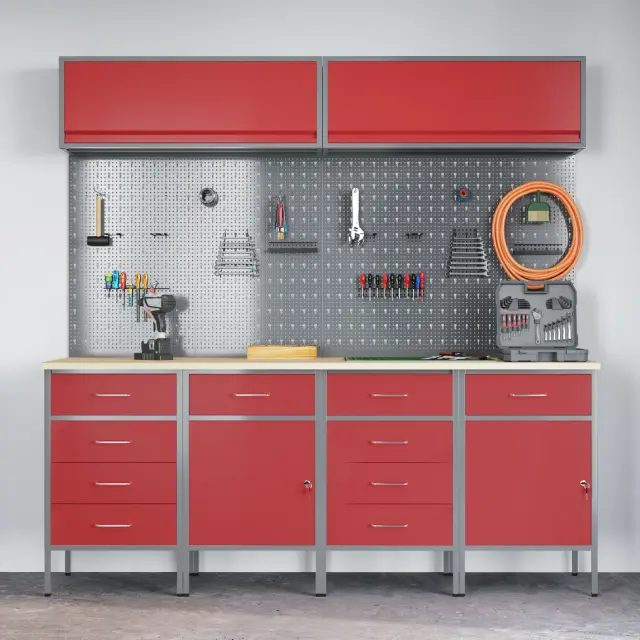 Ta večfunkcionalna omarica za delavnico kombinira stil in praktičnost ter skrbi za urejenost tvojih orodij v garaži ali delavnici. S svojimi živahnimi rdečimi in sivimi barvami prinaša sodoben pridih, obenem pa ti nudi dovolj prostora za tvojo opremo.
