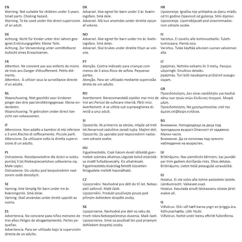 Opozorilo. Ni primerno za otroke, mlajše od treh let.Nevarnost zadušitve zaradi tujka. Majhni deli. Opozorilo. Za uporabo pod neposrednim nadzo rom odrasle osebe.