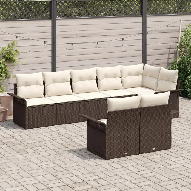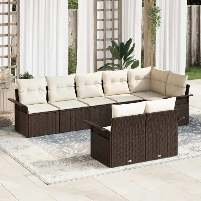 Ta set zunanji kavčev vas vabi, da se sprostite in preživite čas z prijatelji. Ponuja odlično kombinacijo elegance in funkcionalnosti. Super je za vrtove ali balkone, z modernim rjavim in krem dizajnom, ki dodaja stilski pridih vsakemu zunanjemu prostoru.