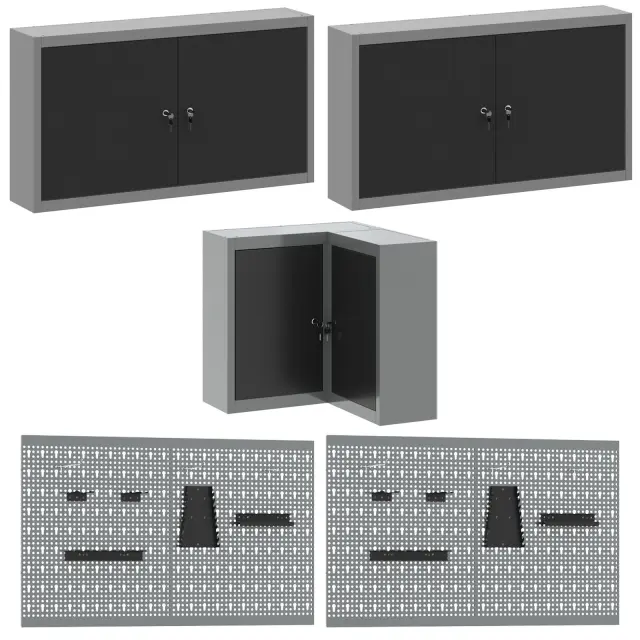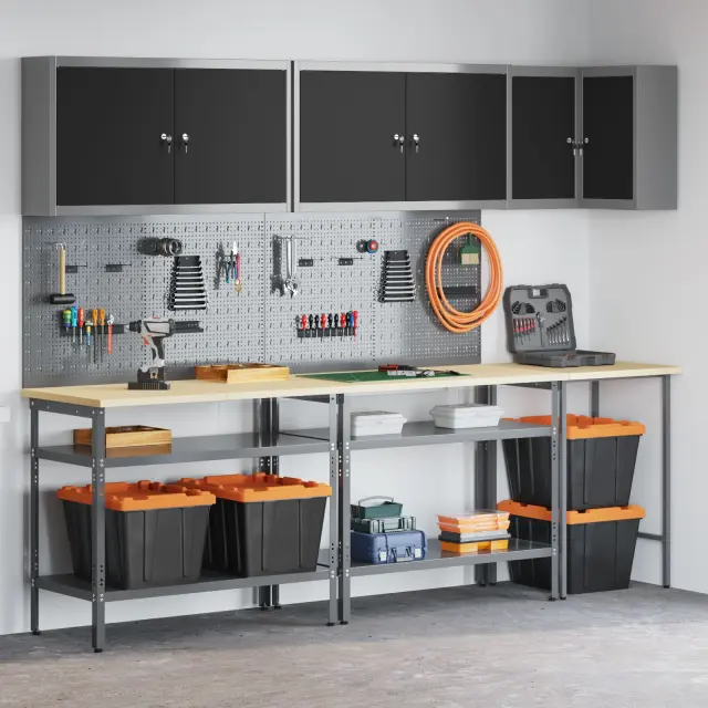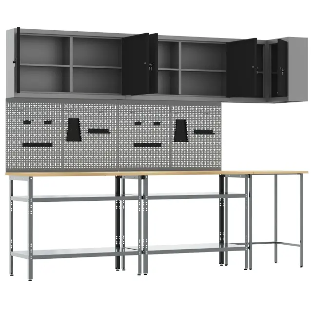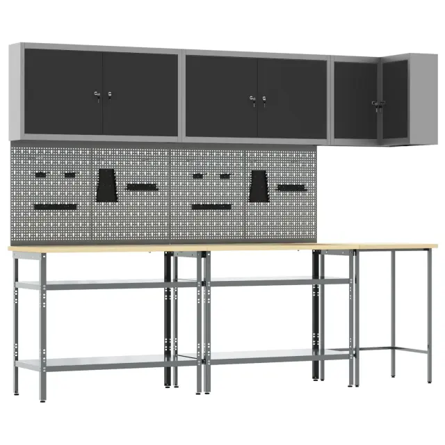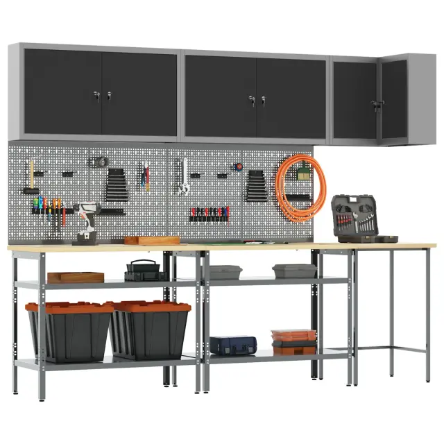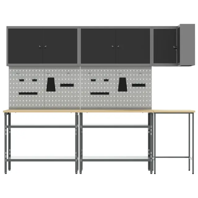 Ta kotna miza za shranjevanje orodja z nastavljivo višino je nujna za tvojo delavnico ali garažo. Ima stilno industrijsko zasnovo, ki se super prilega vsakemu delovnemu prostoru. Z obiljem prostora za tvoje orodje omogoča prilagoditev višine, kar je idealno za vsak projekt.