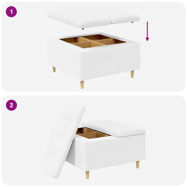 • Vzdrževanje in Nega: Da ohranite njeno prvotno stanje, pogosto posesajte oblazinjeni vrh. To enostavno vzdrževanje skrbi, da tkanina ostane brez prahu in drugih drobcev ter ohranja izgled otomane skozi čas.