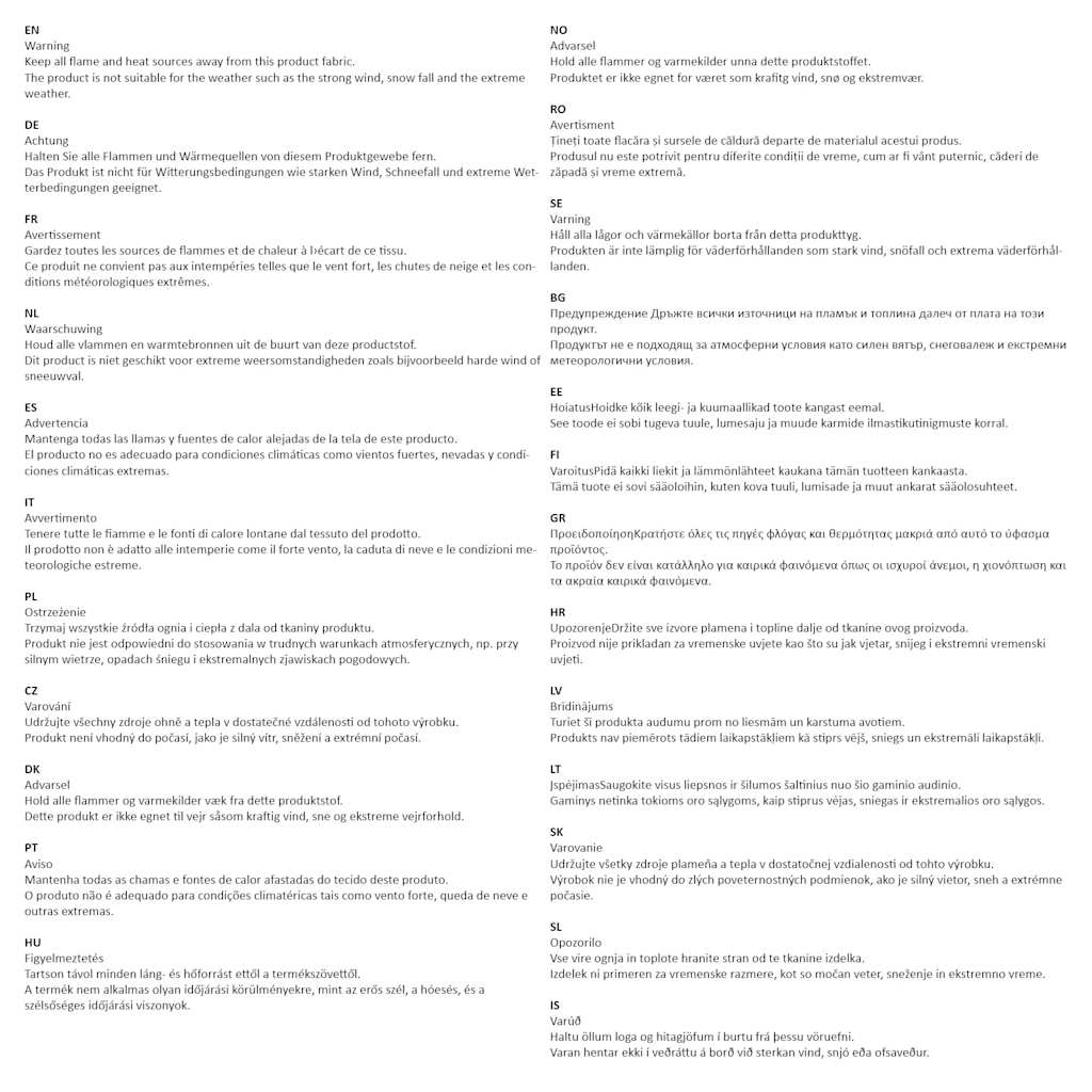 Opozorilo Vse vire ognja in toplote hranite stran od te tkanine izdelka. Izdelek ni primeren za vremenske razmere, kot so močan veter, sneženje in ekstremno vreme.
