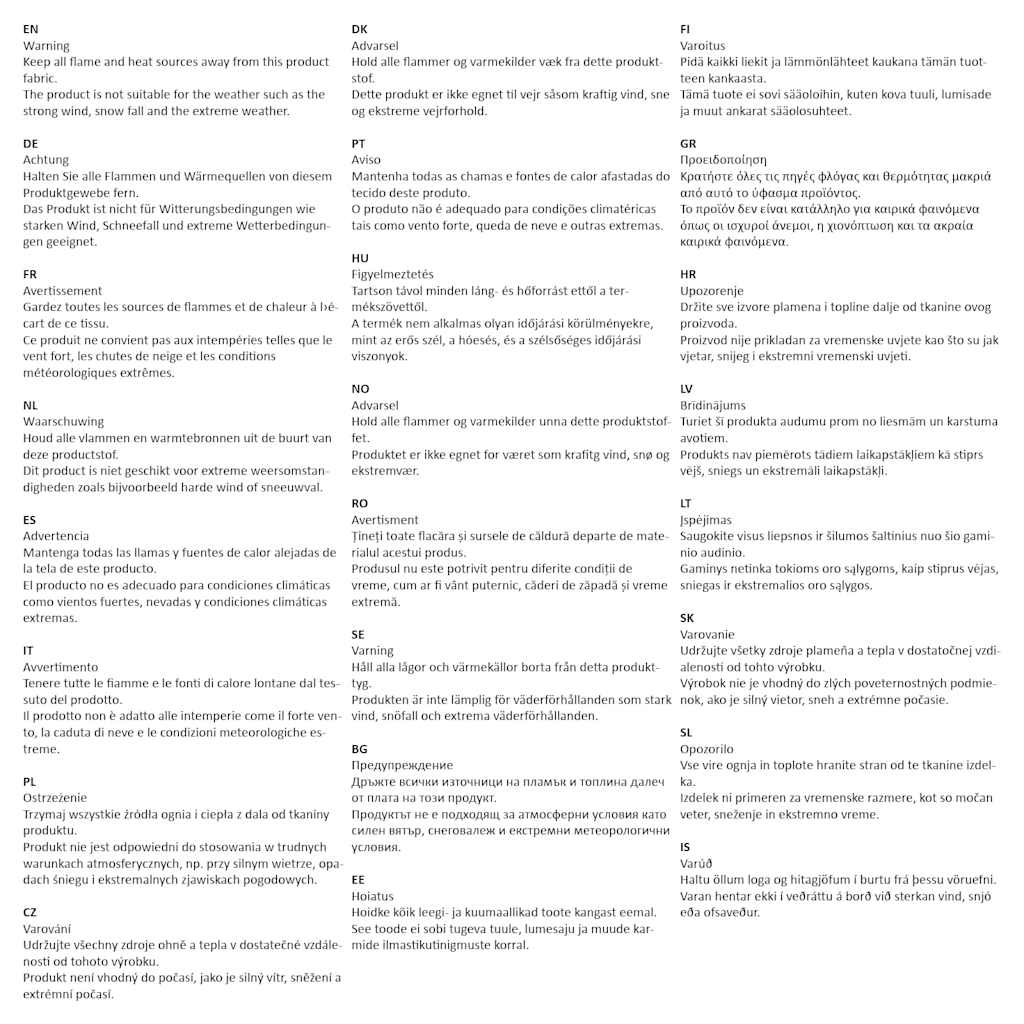 Opozorilo Vse vire ognja in toplote hranite stran od te tkanine izdelka. Izdelek ni primeren za vremenske razmere, kot so močan veter, sneženje in ekstremno vreme.