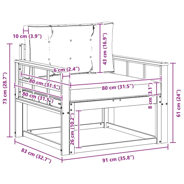 • 1 x hrbtna blazina: 80 x 43 x 10 cm (D x Š x V)