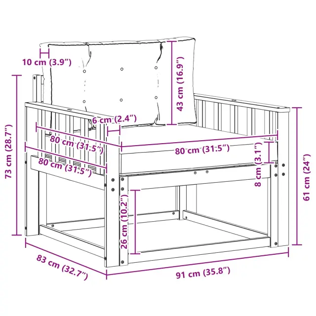 • 1 x hrbtna blazina: 80 x 43 x 10 cm (D x Š x V)