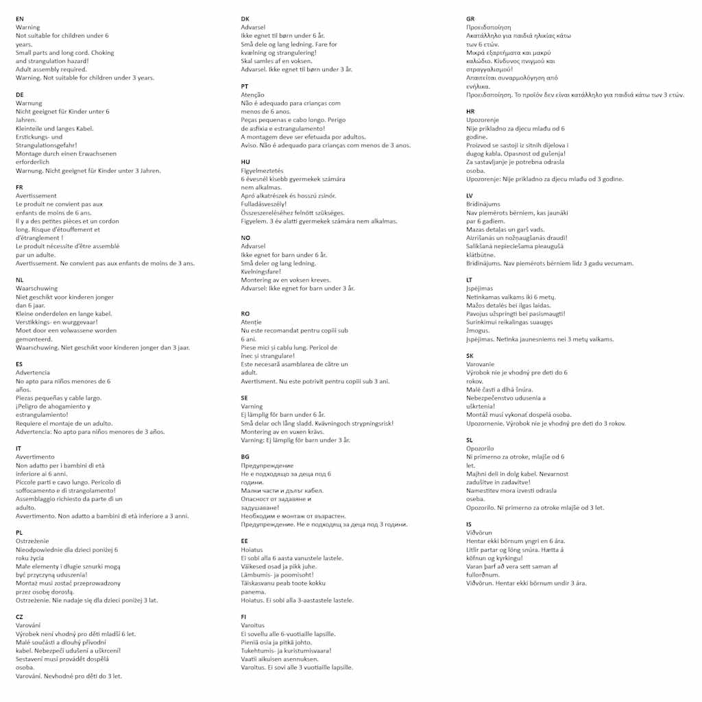 Opozorilo Ni primerno za otroke, mlajše od 6 let. Majhni deli in dolg kabel. Nevarnost zadušitve in zadavitve! Namestitev mora izvesti odrasla oseba. Opozorilo. Ni primerno za otroke mlajše od 3 let.