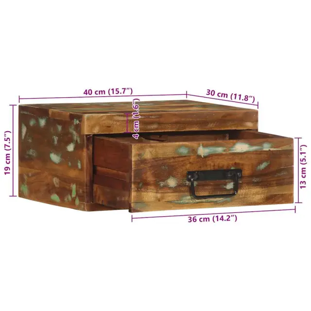 Ta stenska nočna omarica je popolna rešitev za vaš bivalni prostor, s katero boste izkoristili prostor in ohranili talne površine čiste. Robustno in stabilno: Trden predelan les je sestavljen iz ponovno uporabljenega lesa, kot so tikovina, mangov les, borov les in bukev. Ti materiali so reciklirani iz starih zgradb, kot so tovarne, lope in čolni. Znaki obrabe in vidna struktura vzorcev vsakemu kosu dodajajo svojo zgodovino in edinstven videz.Zasnova za namestitev na steno: Lebdečo nočno omarico je mogoče namestiti na steno in tako ustvariti dodaten prostor za shranjevanje. Tako lahko kar najbolje izkoristite svojo talno površino in ohranite urejen prostor.Veliko prostora za shranjevanje: V plavajoči nočni omarici je dovolj prostora za shranjevanje revij, knjig, kozarcev in drugih potrebščin za spanje, saj so urejene in dosegljive.Robusten vrh: Na trpežen zgornji del nočne stenske omarice lahko namestite namizne svetilke, budilke, knjige, okvirje za slike, majhne lončnice, okraske ali druge potrebščine.Enostavno vzdrževanje: Zaradi gladke površine je stensko nočno omarico enostavno očistiti z vlažno krpo in zahteva manj vzdrževanja. Dobro je vedeti:Vijaki in čepi za notranjost stene niso priloženi. Svetujemo vam, da poiščete in uporabite vijake in zatiče, ki so primerni za vaše stene. Če niste prepričani, se lahko posvetujete s strokovnjakom. Preberite in upoštevajte vse korake v navodilih.Barva: Večbarvno Material: Trden predelan lesDimenzije: 40 x 30 x 19 cm (Š x G x V)Maks. nosilnost (skupaj): 60 kgPotrebno sestavljanje: Da 4017453