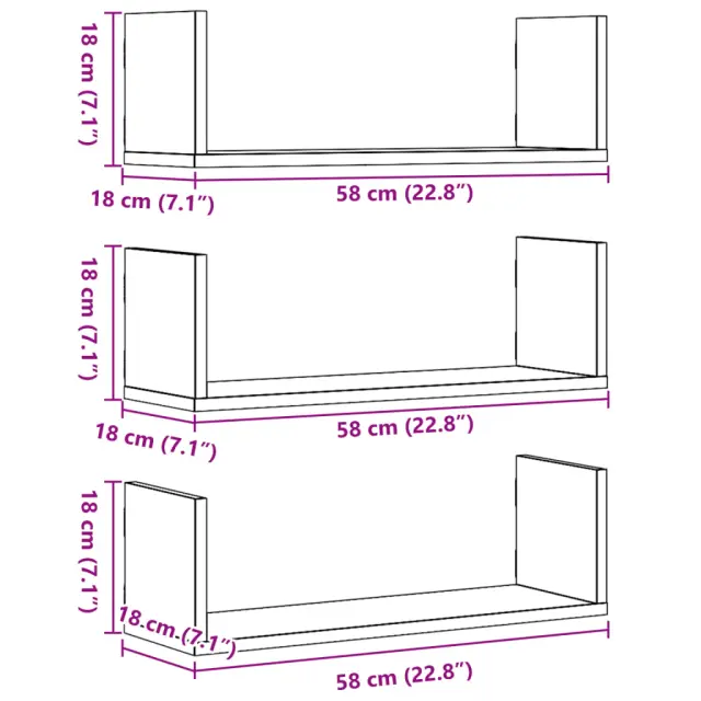 vidaXL Stenska polica 3 kosi sonoma hrast 58x18x18 cm inženirski les