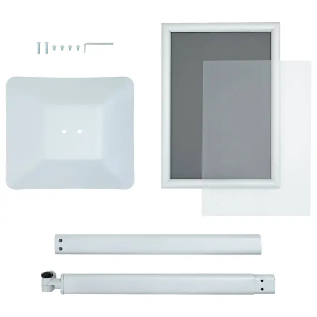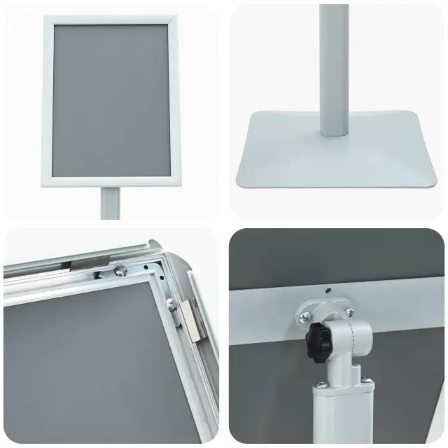 • Materialna sestava: To stojalo ima stabilno osnovo iz litoželeza in aluminijast okvir, kar zagotavlja trdnost. Prikazna plošča je iz PS plošče s PVC zaščitnim filmom, kar omogoča enostavno menjavo plakatov.