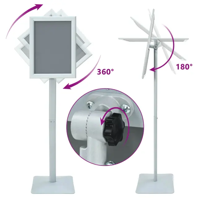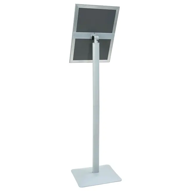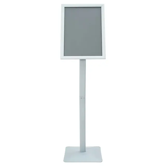 Stojalo za plakate na podstavku je super izbira za prikazovanje tiskovin v poslovnih prostorih. Ima stabilno osnovo, prilagodljivo nosilno napravo in čist dizajn, ki omogoča jasno predstavitev informacij. Odlično je za sprejemne prostore, trgovine in razstave, kjer je pomembna fleksibilnost in preglednost.