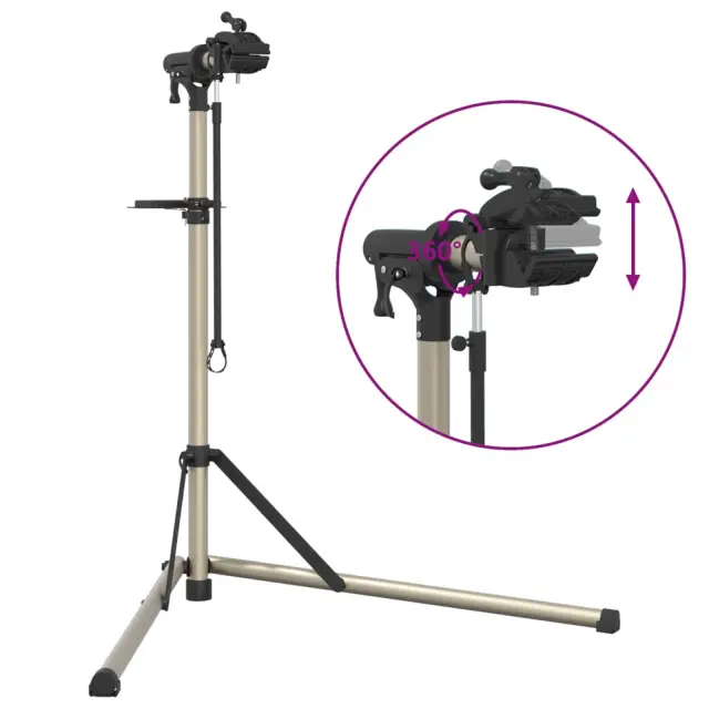 • Nastavljiva višina: Višino stojala za popravilo kolesa lahko enostavno nastavite z ročajem za hitro sprostitev, kar vam omogoča, da kolo postavite na udobno delovno višino.