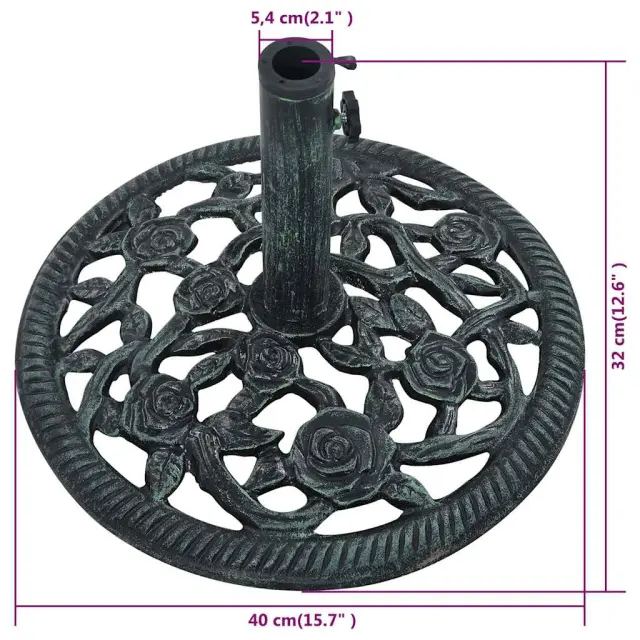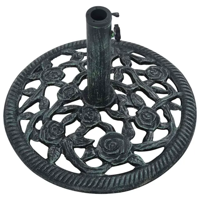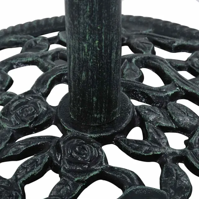 To trdno stojalo za senčnik služi kot močan in čvrst podstavek za vaš senčnik, saj ga bo zadržalo na mestu. Vzdržljivo lito železo zagotavlja izjemno stabilnost. Priložen adapter je primeren za senčnike s cevjo premera 35, 38 ali 48 mm. Dodelane podrobnosti in očarljiv cvetlični vzorec bodo vašemu vrtu ali drugemu zunanjemu prostoru dodali pridih stila.Barva: ZelenaMaterial: Lito železoDimenzije: 40 x 32 cm (premer x V)Teža: 9 kgPremer cevi: 54 mmNotranji premer plastične cevi: 35 mmNotranji premer podpornega obroča: 40 mmZ adapterjem za senčnike s premerom palice 35/38/48 mm 47863