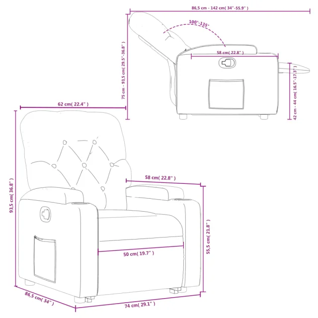 • Funkcija ročnega nagiba: Ta stol z nagibom ima ročaj na desni strani. S preprostim potegom ročaja lahko ročno nastavite naslon za noge in naslonjalo za hrbet v poljuben položaj glede na vaše udobje. Ta funkcija omogoča največji nagib 135 stopinj. Poleg tega lahko naslonjalo hitro vrnete na prvotno mesto z enostavnim potegom ročaja.