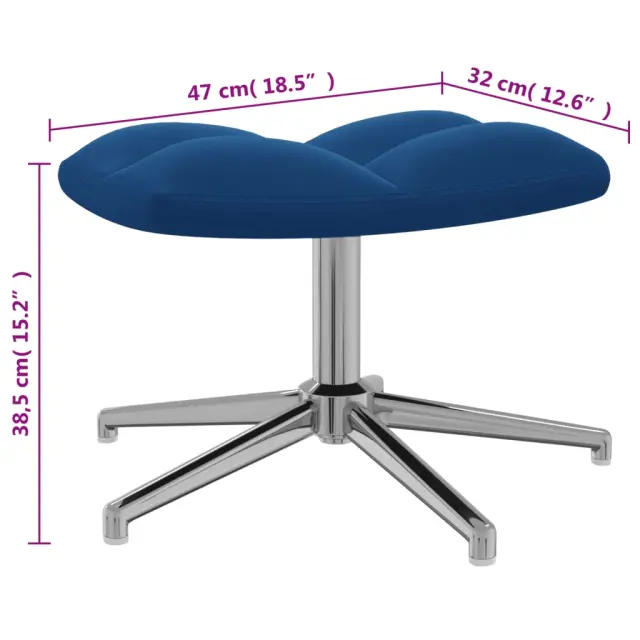 Naslanjač je estetsko dodelan s kvadrati. Zaradi debele penaste podloge, ki je oblečena v mehak žamet, lahko uživate v optimalnem udobju med sedenjem. Ta stol za sproščanje je zelo fleksibilen, saj se vrti za 360 stopinj. Stol za sproščanje s stolčkom je podprt z jeklenim okvirjem in nogami, zato je stabilen in vzdržljiv.
