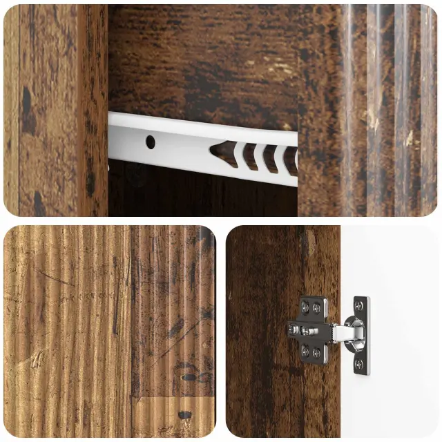 • Izdelava iz inženirskega lesa: Omara je narejena iz inženirskega lesa, znanega po trdnosti in gladkem zaključku. Ta material zagotavlja stabilno in trdno konstrukcijo, ki se ne upogiba in posnema klasična lesena zrna.