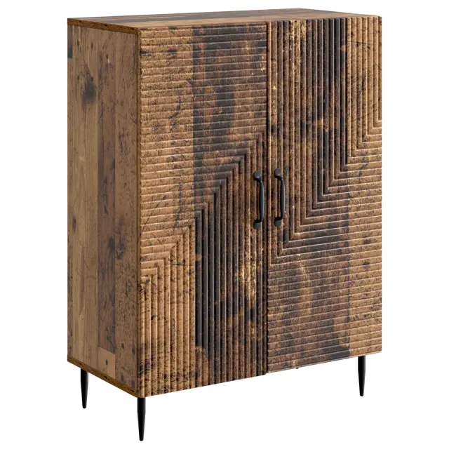 Ta moderna stranska omarica prinaša brezčasno vintage privlačnost in odlične rešitve za shranjevanje v sodobnem prostoru. Njena elegantna pravokotna oblika se brez težav prilega v dnevno sobo, jedilnico ali odprte prostore. Z odlično kombinacijo inženirskega lesa in črnih kovinskih detajlov je pravi dodatek tvojemu domu in ponuja funkcionalnost za organizacijo ter prikaz predmetov.