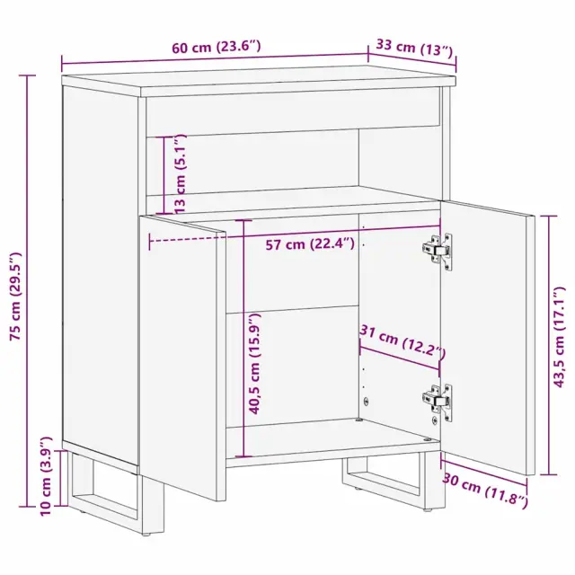 • Kakovostna konstrukcija: Zgrajena iz trdega mangovega lesa in inženirskega lesa, ta stranska omara je narejena, da traja. Materiali ji dajejo trdnost in odpornost na obrabo, super za vsakodnevno uporabo. Dovolj trdna, da podpira vse tvoje shranjevalne potrebe.