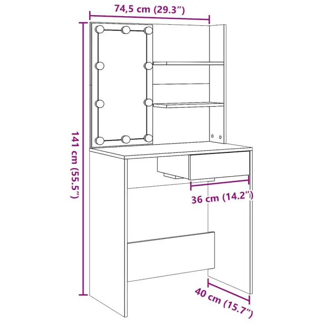 vidaXL Toaletna mizica z LED lučkami artisan hrast 74,5x40x141 cm