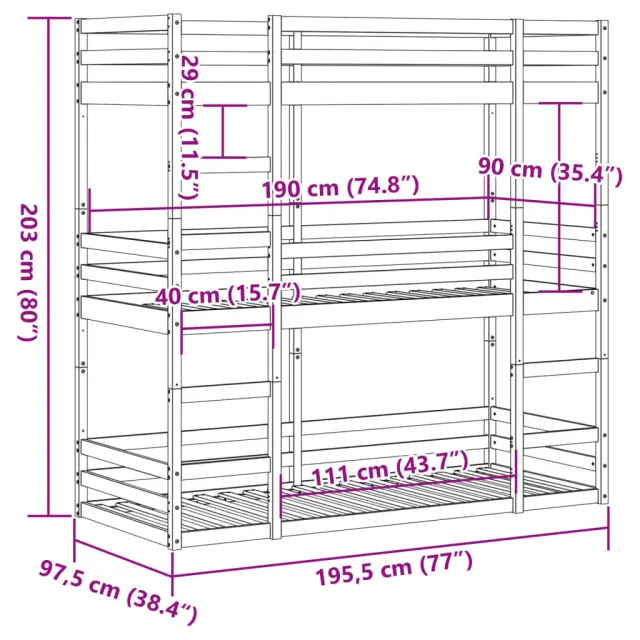 vidaXL Trojni pograd 90x190 cm trdna borovina