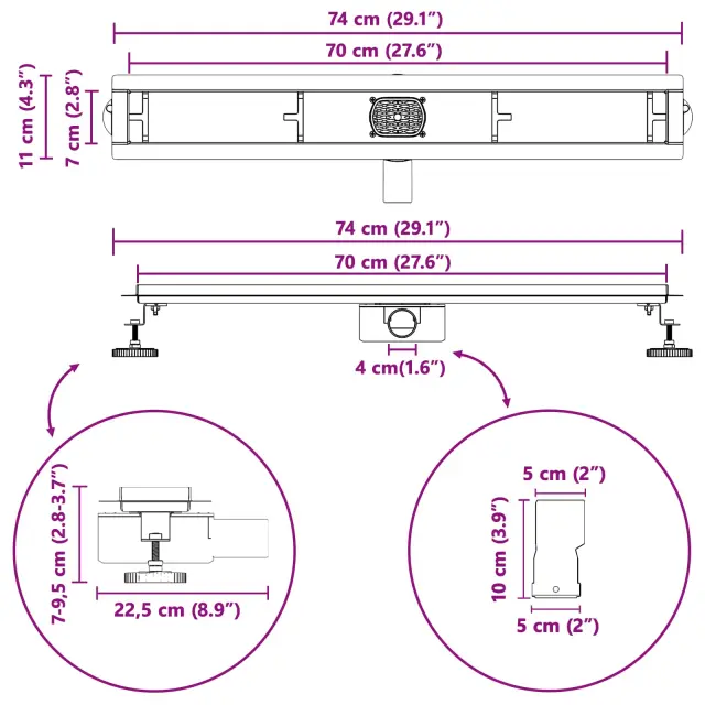 vidaXL Tuš odtok 2-v-1 z 360° sifonom srebrna 70 cm
