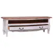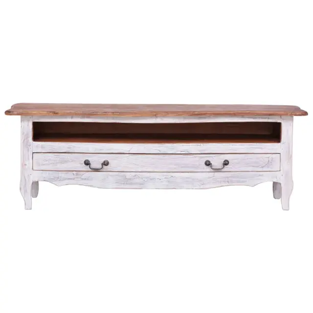 Z našo leseno TV omarico lahko svojemu notranjemu dekorju dodate pridih rustikalnega šarma! Ta televizijska polica iz masivnega mahagonijevega lesa je izjemno trpežna in robustna. Mahagoni je tropski trd les, ki ga odlikujejo lepota, trpežnost in barva. Posebna obrt je bila uporabljena za vintage, topel in pristen videz tega izdelka. Ročna izdelava in lepi vzorci trdnega lesa zagotavljajo, da je vsaka naša TV skrinja malo drugačna od naslednje. To čudovito stereo stojalo ima 1 velik predal in 1 odprt predelek, zato bo v pomoč pri urejenemu shranjevanju stvari. Izdelek je že sestavljen; sestava ni potrebna. Pomembna opomba: Vzorci lesa in barve se lahko od kosa do kosa razlikujejo, zato je vsaka naša stereo omarica edinstvena. Dostava je naključna, kar zagotavlja ekskluzivnost in individualnost vašega izdelka.Barva: Bela in naravna barva lesaMaterial: Trden mahagonijDimenzije: 120 x 30 x 40 cm (Š x G x V)Z 1 predalom in 1 odprtim predelkomMontaža ni potrebna 283902
