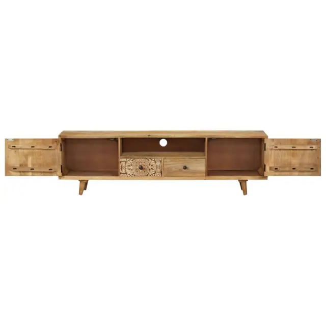 Ta lesena TV omarica se bo odlično podala v vaše notranje prostore. Ta HiFi omarica je izdelana iz trdnega mangovega lesa, trdega lesa z gostimi vzorci. Robusten mangov les ima sposobnost prenašanja teže, učinkovito pa se spopada tudi z obrabo. Prav zato je ta čudovito zasnovana omarica izjemno stabilna, vzdržljiva in vpadljiva. Ta stereo omarica je v celoti izdelana ročno, lepi vzorci lesa pa zagotavljajo, da je vsak kos pohištva čudovit in malo drugačen od drugih. Ta nizka omarica se ponaša z 2 predaloma, 1 predelkom in 2 prostoroma z vrati, zato nudi dovolj prostora za shranjevanje multimedijskih naprav, knjig ter ostalih stvari. Pomembna opomba: Barve se od kosa do kosa razlikujejo, zato je vsak kos edinstven. Dostava je naključna, kar zagotavlja ekskluzivnost in individualnost vašega izdelka.Material: Trden mangov les, inženirski lesDimenzije: 140 x 30 x 40 cm (Š x G x V)Zaključek: Brušeno, barvano in lakiranoZ 2 vratiZ 2 predaloma in 1 odprtim predelkom za shranjevanje 249856
