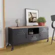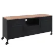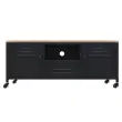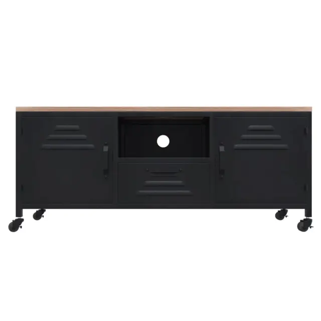 Ta TV omarica bo ključna točka vaše dnevne sobe ali spalnice. Vrhunski material: TV enota je izdelana iz železa in trdnega lesa jelke, zaradi česar je zelo stabilna in trpežna.Veliko prostora za shranjevanje: TV stojalo ima 1 predal, 1 polico in 2 predelka za organizirano shranjevanje DVD predvajalnikov, igralnih konzol, sprejemnikov in nosilcev medijev.Trdna površina: Medijska omarica ima trdno leseno površino, zaradi česar je idealna za razstavljanje okrasnih predmetov, okvirjev za fotografije, lončnic itd.Priročen dizajn: TV stojalo je opremljeno s 4 kolesi, zato ga lahko prilagodljivo postavite in enostavno premikate. Poleg tega je na zadnji plošči luknja za urejanje kablov medijskih in elektronskih naprav.Barva: ČrnaMaterial: Železo, trden les jelkeDimenzije: 110 x 30 x 43 cm (Š x G x V)S 4 kolesiMaks. nosilnost (skupaj): 50 kgMaks. nosilnost na predal: 2,5 kgMaks. nosilnost na polico: 5 kgPotrebno sestavljanje: Da 340766