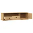 Ta lesena TV omarica z veliko prostora za shranjevanje je praktičen in privlačen dodatek za vašo dnevno sobo ali spalnico. Trdna borovina: Trdna borovina je čudovit naravni material. Borovina ima ravne vzorce, grče pa dajejo materialu njegov značilen, rustikalen videz. Stojalo za TV je izdelano iz trdnega borovega lesa, zato je trpežno in stabilno. Veliko prostora za shranjevanje: TV omarica ima 2 predala, 1 odprt predelek in 1 predelek z vrati, kar zagotavlja dovolj prostora za shranjevanje revij, knjig, DVD-jev in večpredstavnostnih naprav, da so dobro urejene in na dosegu roke.Enostavno vzdrževanje: TV omarico je enostavno očistiti z vlažno krpo in zahteva manj vzdrževanja.Kovinski ročaj in gumb: Medijska omarica je opremljena s kovinskimi ročaji in gumbom, ki omogočajo enostavno odpiranje in zapiranje predalov in vrat, hkrati pa dodajajo dodatno lepoto.Material: Trdna borovina s premazom iz medenega voska, inženirski les, kovinaDimenzije: 156 x 40 x 40 cm (Š x G x V)Zunanja velikost predala: 48 x 15 cm (D x Š)Notranje dimenzije predala: 44 x 30 x 12 cm (Š x G x V)Dimenzije predelka: 100 x 35 x 15 cm (Š x G x V)Velikost vrat: 48 x 31 cm (D x Š)Z zasnovo roletZbirka: VIGOPotrebno sestavljanje: Da 353172