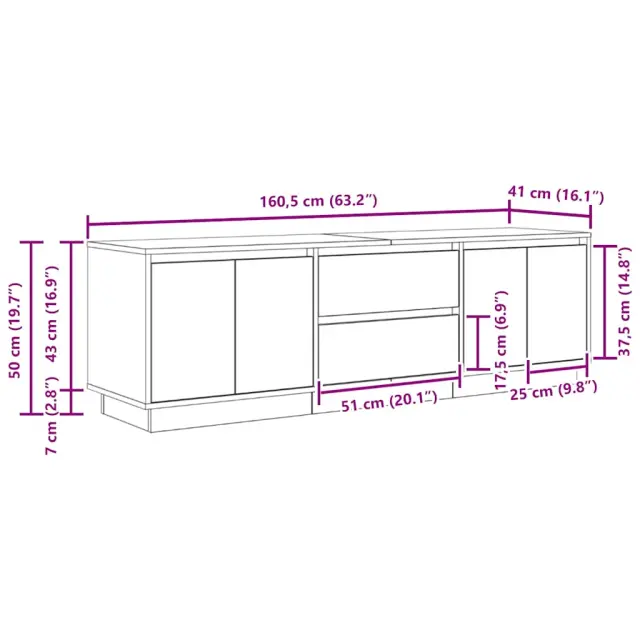 Ta TV omarica z LED lučkami se ponaša s trendovskim in praktičnim dizajnom, zato bo postala glavna točka vašega prostora. Stabilen in trpežen material: Inženirski les je trpežen in stabilen material z gladko površino, ki je odporen na vlago, krivljenje in cepljenje, zato je zanesljiva izbira za različne projekte.Veliko prostora za shranjevanje: Ta TV omarica nudi dovolj prostora za shranjevanje revij, knjig, DVD-jev in večpredstavnostnih naprav, da bodo dobro urejene in dosegljive.RGB LED osvetlitev za prijeten ambient: V tej omarici so nameščene LED luči, ki jih je mogoče preprosto nastaviti in tako ustvariti prilagojen svetlobni šov. Prilagodite lahko načine, barve in svetlost ter tako izboljšate vzdušje v notranjem prostoru.Stabilna in trpežna namizna plošča: Stabilna mizna plošča je idealna za postavitev televizorja in stereo sistema ali okrasnih predmetov, kot so vaze ali lončene rastline.Enostavno vzdrževanje: TV stojalo je enostavno očistiti z vlažno krpo, saj ne potrebuje veliko vzdrževanja. Opozorilo:Za preprečitev prevračanja je treba ta izdelek uporabiti s priloženo napravo za pritrditev na steno. Dobro je vedeti:Izdelek ima priključek USB, ki zahteva certificiran vir napajanja 5 V USB (ni priložen).Barva: Starinski lesMaterial: Inženirski lesCelotne mere: 160,5 x 41 x 50 cm (Š x G x V)Dimenzije predalov (vsak): 51 x 33,5 x 17,5 cm (Š x G x V)Z 2 predaloma in 4 vratiPotrebno sestavljanje: Da 3328433