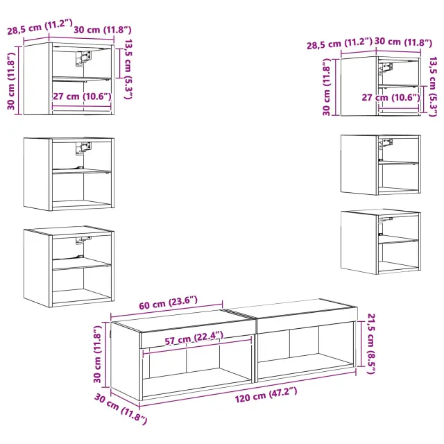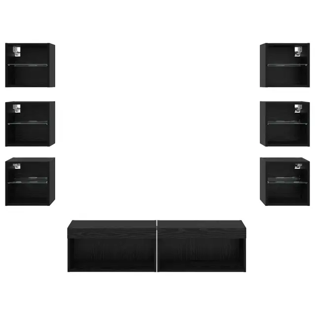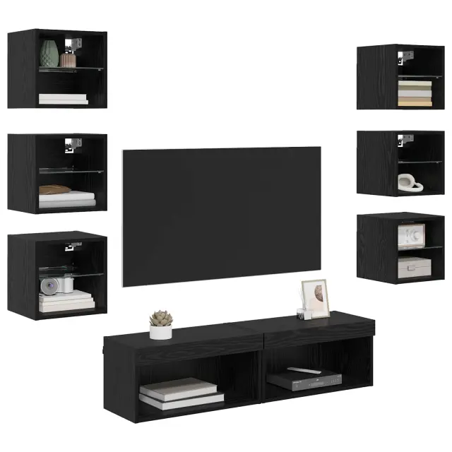 vidaXL TV omarica z LED lučmi s predalom 8 pcs Črna Orehovina Steklo