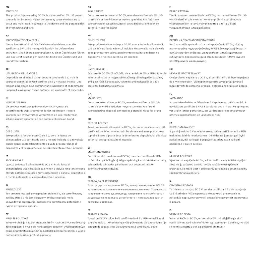 OBVEZNA UPORABA Ta izdelek se napaja z DC 5 V, vendar certificirani 5 V vir napajanja USB ni priložen. Višja napetost lahko povzroči pregrevanje in poškoduje napravo ter povzroči potencialno nevarnost pregrevanja in požara.