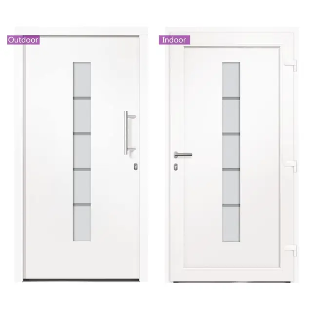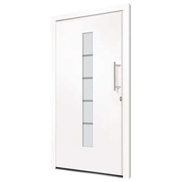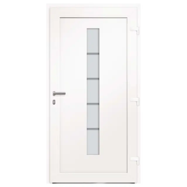 Ta vhodna vrata so posebej zasnovana, da bodo obogatila vhodni prostor v vaši hiši ter zagotovila dodatno varnost vašega doma. Združujejo eleganco z odličnim dizajnom in tehničnimi lastnostmi za vse, ki želijo namestiti vrata. Ta vhodna vrata so opremljena s stabilnim okvirjem in polnilom, aluminijastim pragom, nastavljivimi tečaji, 5-smerno varnostno ključavnico s kavljem in sornikom, izolacijsko zasteklitvijo in ojačitvijo iz pocinkanega jekla. Vhodna vrata, izdelana iz aluminija in PVC materiala, navdušujejo tudi z robustno kakovostjo in visoko priročnostjo zaklepanja. Priložen je celoten komplet, vključno z inox potisnim ročajem, notranjo kljuko, ključi, tesnilnim trakom in kompletom za montažo.Barva: BelaMaterial: PVC, aluminij s prašnim premazom, sendvič polnilo s stiroporomVelikost: 110 x 210 cm (Š x V)Teža vrat: 69,6 kgOpremljena z aluminijastim pragomVelikost aluminijastega praga: 7 x 3 cm (Š x V)Debelina aluminijastega praga: 1,5 mmDebelina profila okvirja in vratnega krila: 70 mmS PVC folijo v notranjostiZunanjost s prašno premazano aluminijasto ploščo3-slojna toplotno zaščitna zasteklitev po ISO standarduVelikost zasteklitve: 14 x 150 cm (Š x V)3 tečaji nastavljivi po višini in globiniIntegrirana zaščita vzvodaOdpiranje znotraj 3-stranskega tesnila v vratnem krilu5-stopenjska varnostna zasnova s kavljem in sornikomPocinkana jeklena ojačitev pravokotnega profilaUD vrednost 1,3 W / m²KDesno odpiranje navznoterKomplet kljuk za vrata:Inox potisni ročaj 350 mmInox kljukaVključuje 2 rozetiMontažni set:Vključuje 8 plastičnih zagozd, 6 podložk, 6 stenskih sider in 6 kovinskih moznikov (montažni vijaki)Tesnilni trak:Predstisnjena pena8 m na roliPotrebno sestavljanje: DaPaket vsebuje:1 x Vrata1 x Komplet kljuk1 x Komplet ključevTesnilni trakKomplet za montažo 3056808