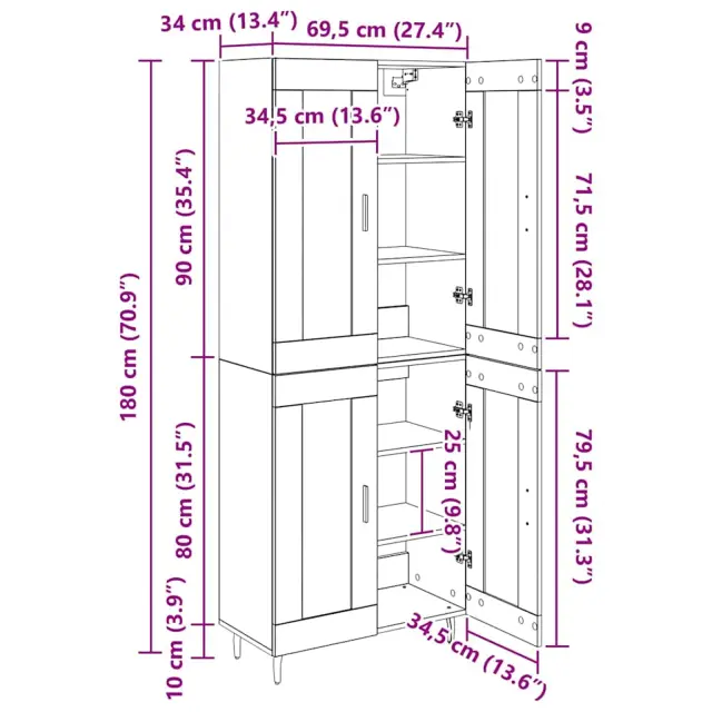 • Obrt iz inženirskega lesa Visoki kabinet je narejen iz kakovostnega inženirskega lesa, ki je zelo vzdržljiv in odporen na obrabo, tako da ostane v odličnem stanju tudi ob vsakodnevni uporabi. Poleg tega material nudi tudi lep in eleganten videz.